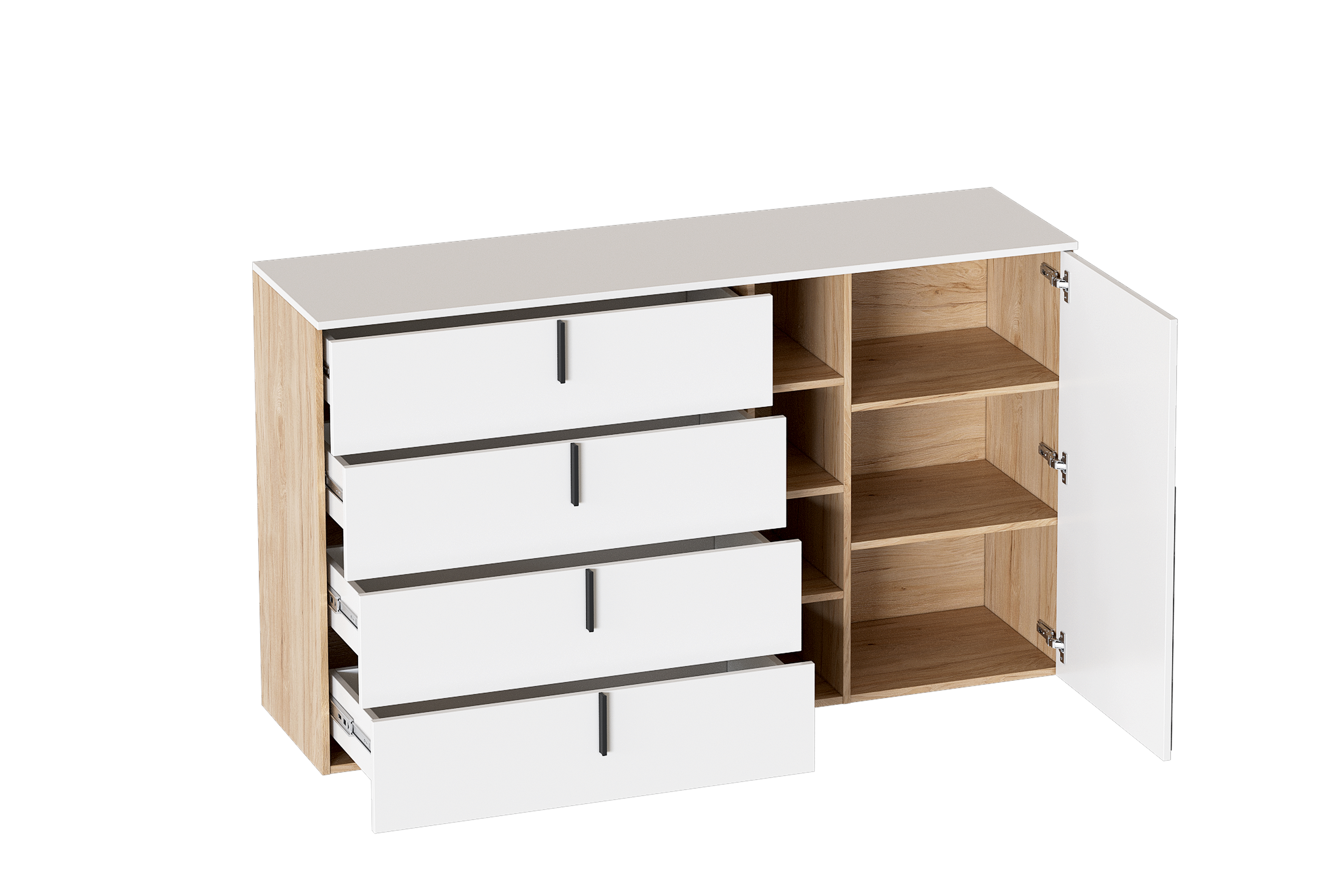 Внутри комода пространство разделено на 3 секции, в левой находится 4 ящика на шариковых направляющих. Средняя секция - открытая с полками. Правая секция закрыта распашной дверью, за которой расположены 2 стационарные полки.