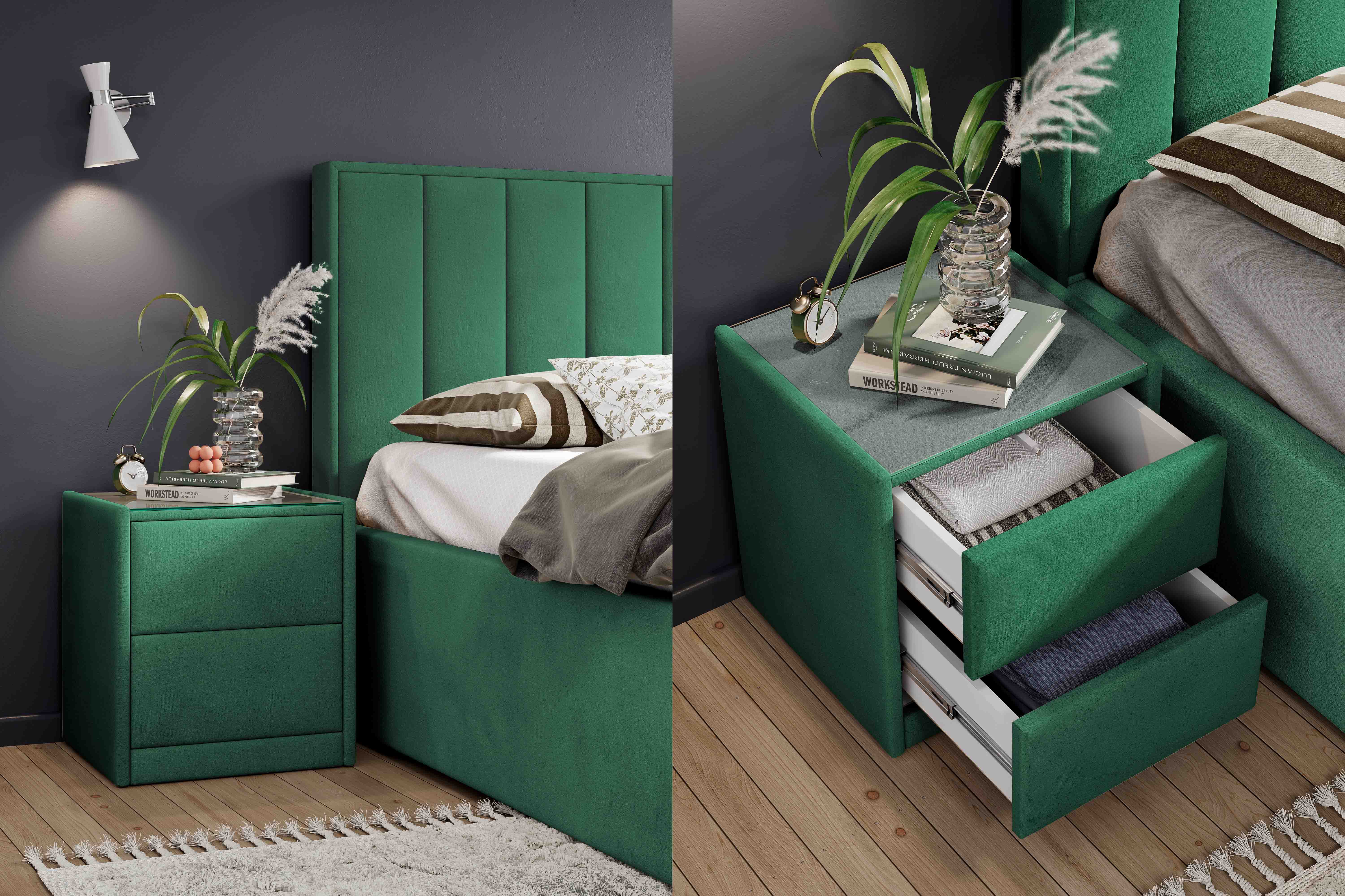 Тумба обтянута высококачественным велюром, что придает ей особый уют и комфорт. Имеет стеклянную столешницу и два вместительных выдвижных ящика с механизмом Push to open. Скругленные торцы модели, минимизируют риск удариться в темноте.