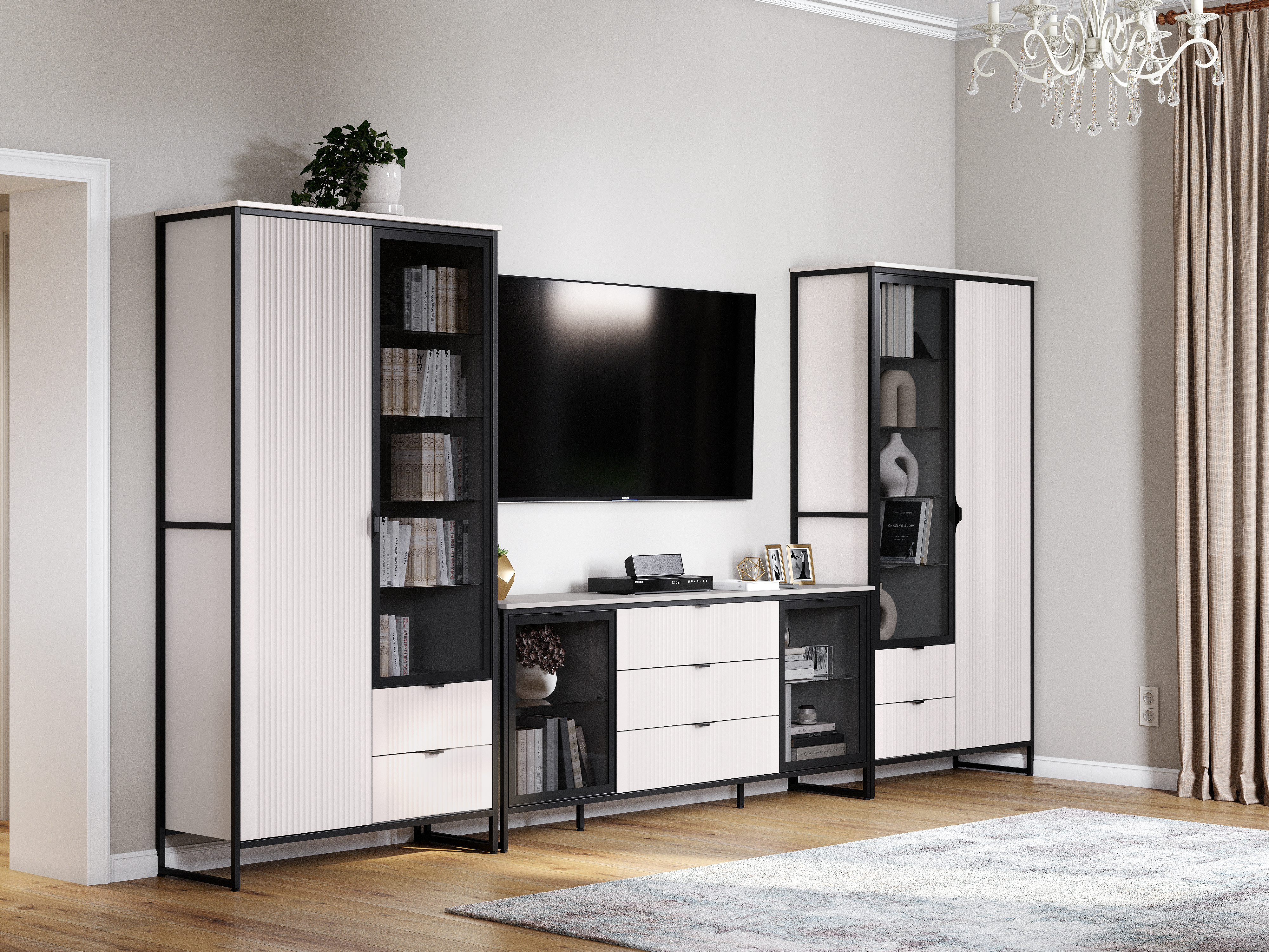 Коллекцию модульной гостиной "Нора" отличает современный оригинальный стиль. Декоративная продольная фрезеровка на фасадах из МДФ и опоры на металлокаркасе цвета соответствуют модным тенденциям этого года в ведущих зарубежных коллекциях.